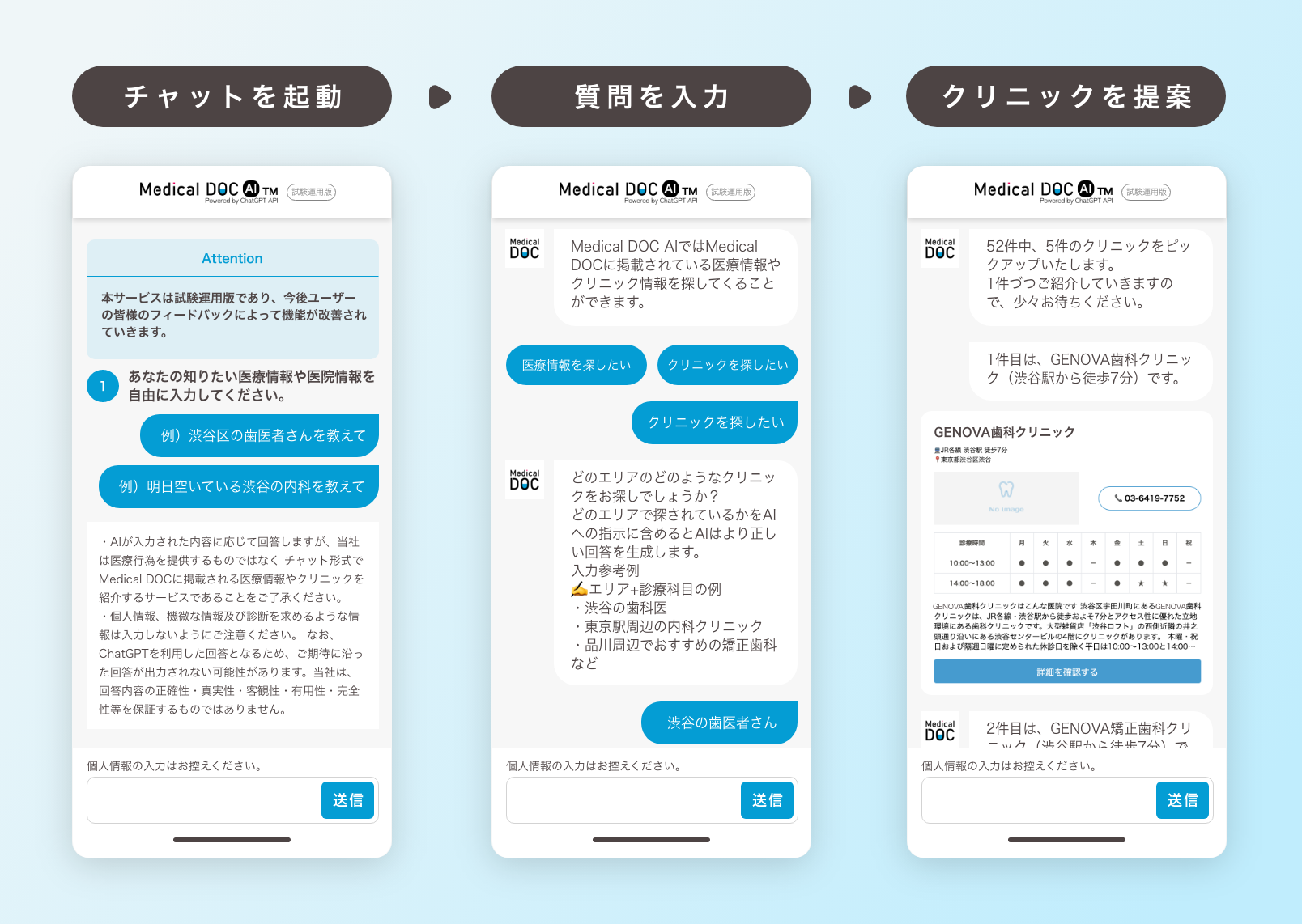「Medical DOC AI™(メディカルドック・エーアイ)」は、まずはβ版として試験的に運用を開始し、今後機能改善を行いながら、より良いサービスを提供できるよう開発を行ってまいります。