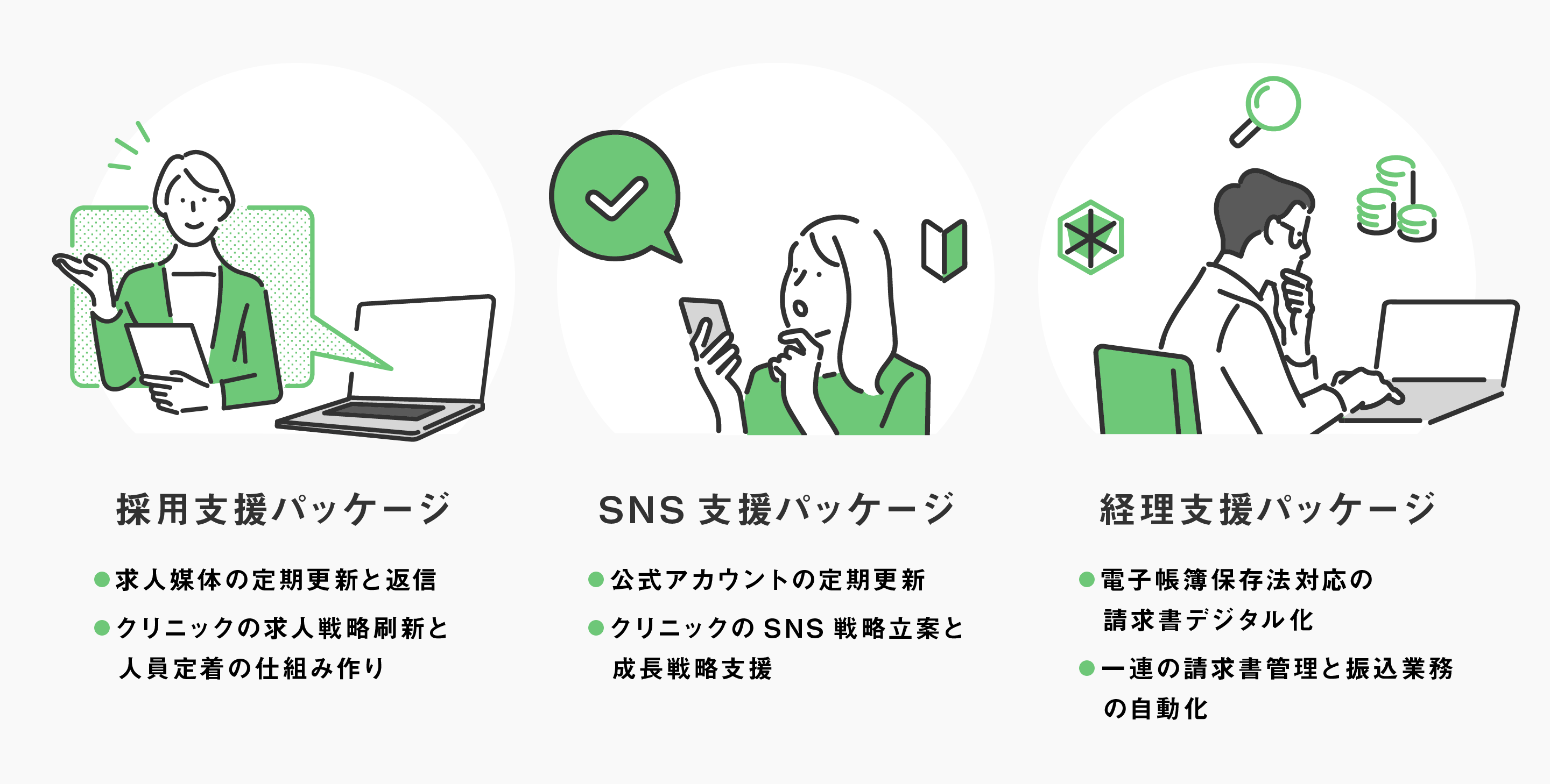 今回の資本業務提携に際し、「採用」「集患」「経理」をテーマ別でパッケージ化したサービスを開発いたしました。