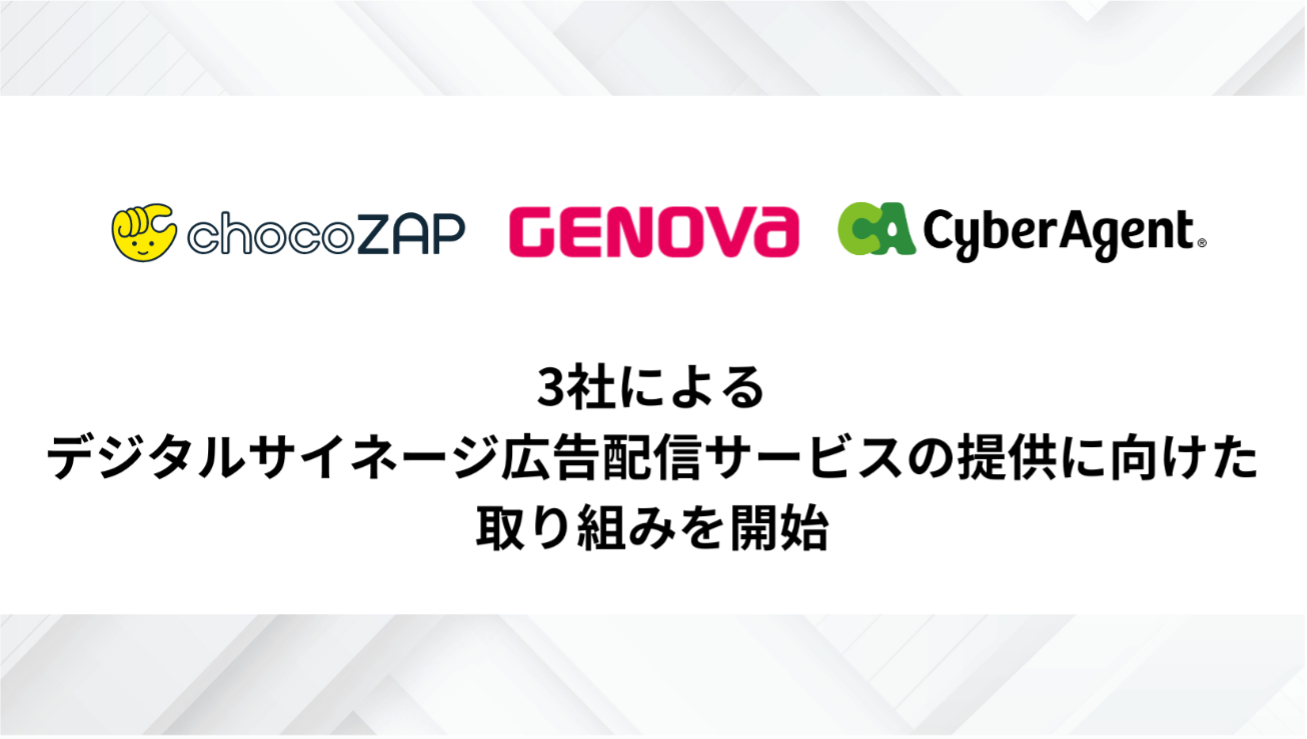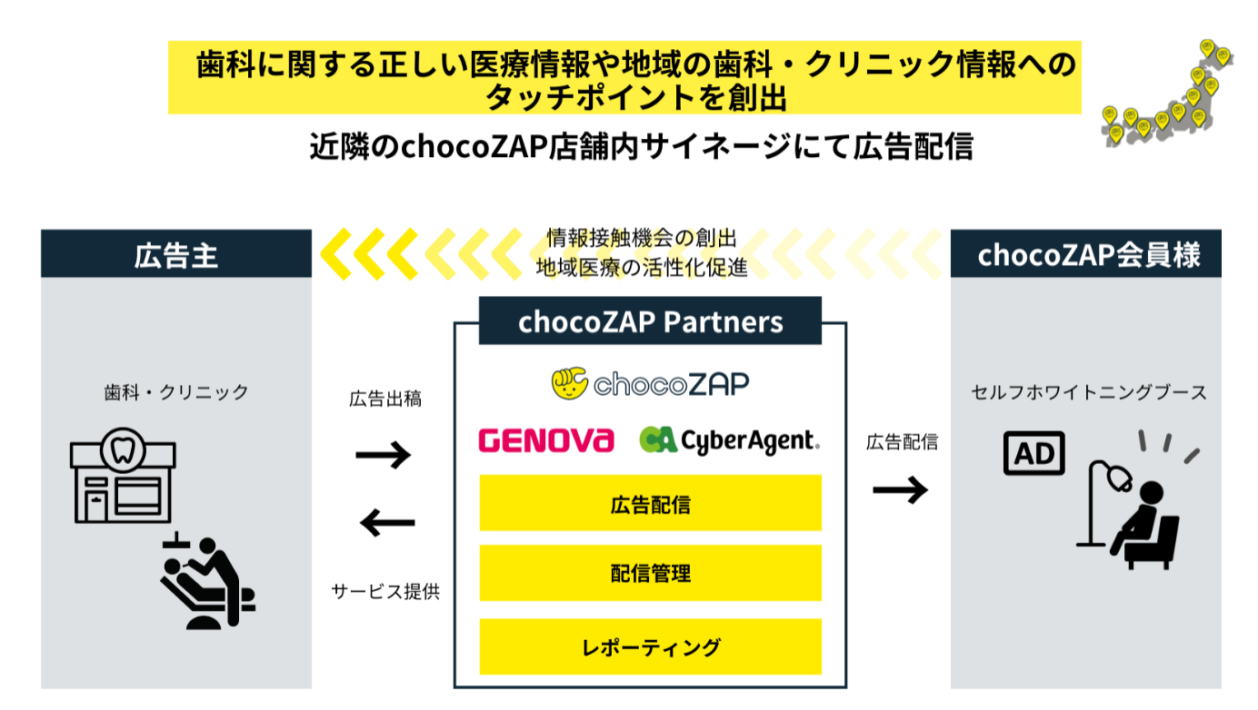 株式会社GENOVA(本社:東京都渋谷区、代表取締役社長:平瀬智樹/以下:GENOVA)は、RIZAP グループ株式会社(本社:東京都新宿区、代表取締役社長 瀬戸健)の連結子会社であるRIZAP株式会社「以下:RIZAP」)のコンビニジム「chocoZAP(チョコザップ)」の新事業「chocoZAP Partners(チョコザップ パートナーズ)」と、株式会社サイバーエージェント(本社:東京都渋谷区、代表取締役:藤田晋、以下「サイバーエージェント」)と連携し共同開発した、歯科に特化したデジタルサイネージ広告配信サービスを総代理店として販売することをお知らせいたします。