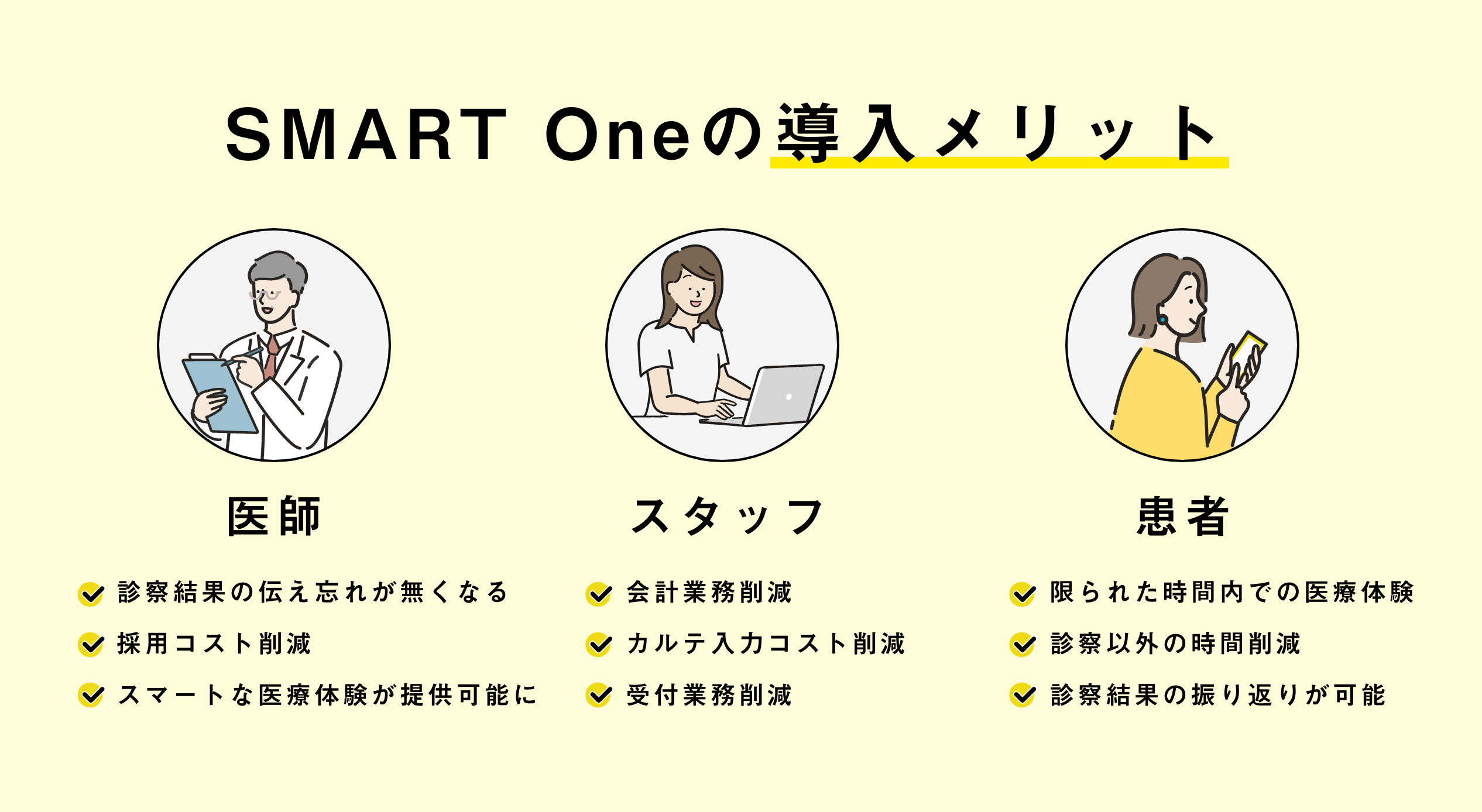 「SMART One(スマートワン)」は、予約・問診・決済がオンラインで完結する予約システムです。予約から問診、決済、予約リマインド通知、診察結果報告までの一連のプロセスを一貫して行うことでクリニックの運営を円滑にし、患者満足度を高めることを目的としています。今後はオンライン診療・薬の配送、デジタル処方箋などの機能追加も予定しています。