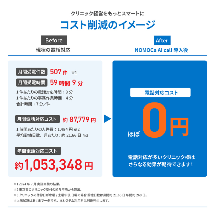 全国には約10万件のクリニック・診療所が存在していますが、そのうち94.3%がAI技術を導入しておらず、AI電話を含むAI技術の普及率はわずか5.7%にとどまっているとされています(※1)。GENOVAは約1.4万件の顧客を有しており、これを基盤に業務効率化とコスト削減を実現する対話型AI「NOMOCa AI call」をリリースします。このサービスにより、クリニックの電話業務を自動化し、医療現場の効率化と利便性向上に貢献してまいります。